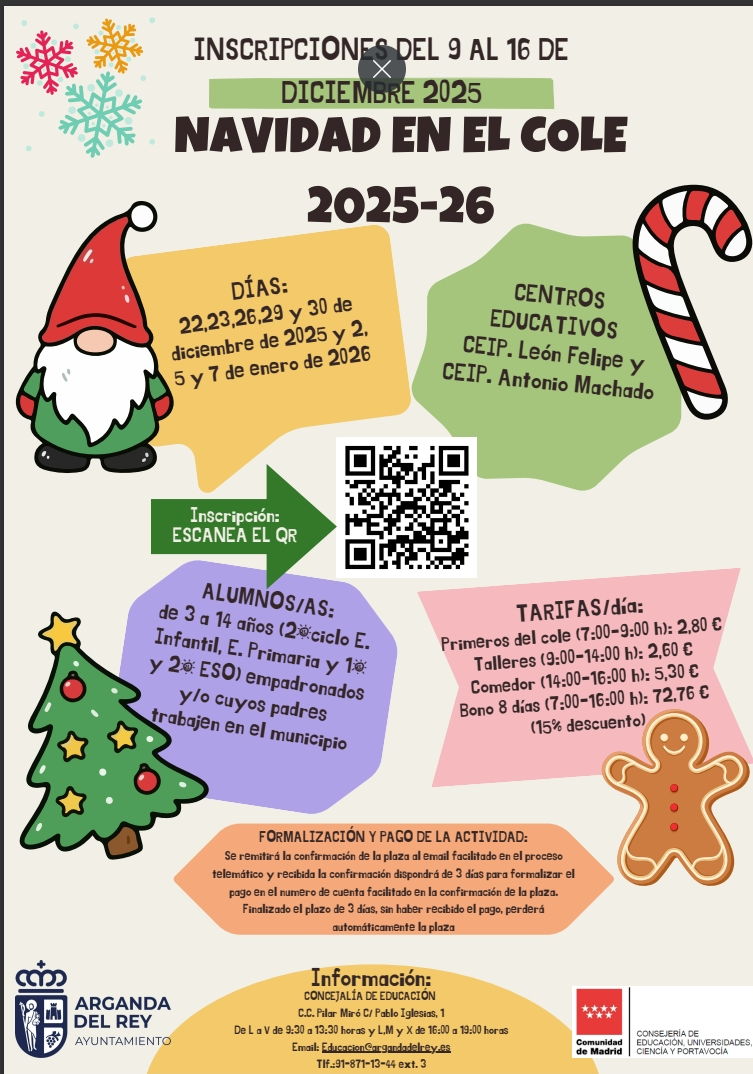 Los centros educativos estarán abiertos los días 22,23,26,29 y 30 de diciembre de 2025 y 2,5 y 7 de enero de 2026, con distintas opciones. De 7:00 a 9:00 horas será el turno de “Los Primeros del Cole”, mientras que de 9:00 a 14:00 horas se desarrollarán diferentes actividades lúdico-educativas, juegos y talleres. Finalmente, de 14:00 a 16:00 horas, los alumnos y alumnas que lo deseen tendrán posibilidad de quedarse en el comedor.